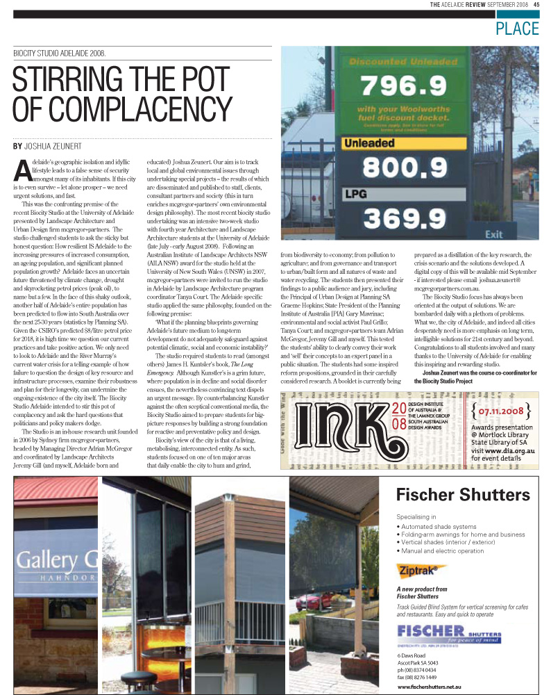 Joshua’s article ‘Stirring the Pot of Complacency‘ was published in The Adelaide Review PLACE (issue 343 September 2008, p46).