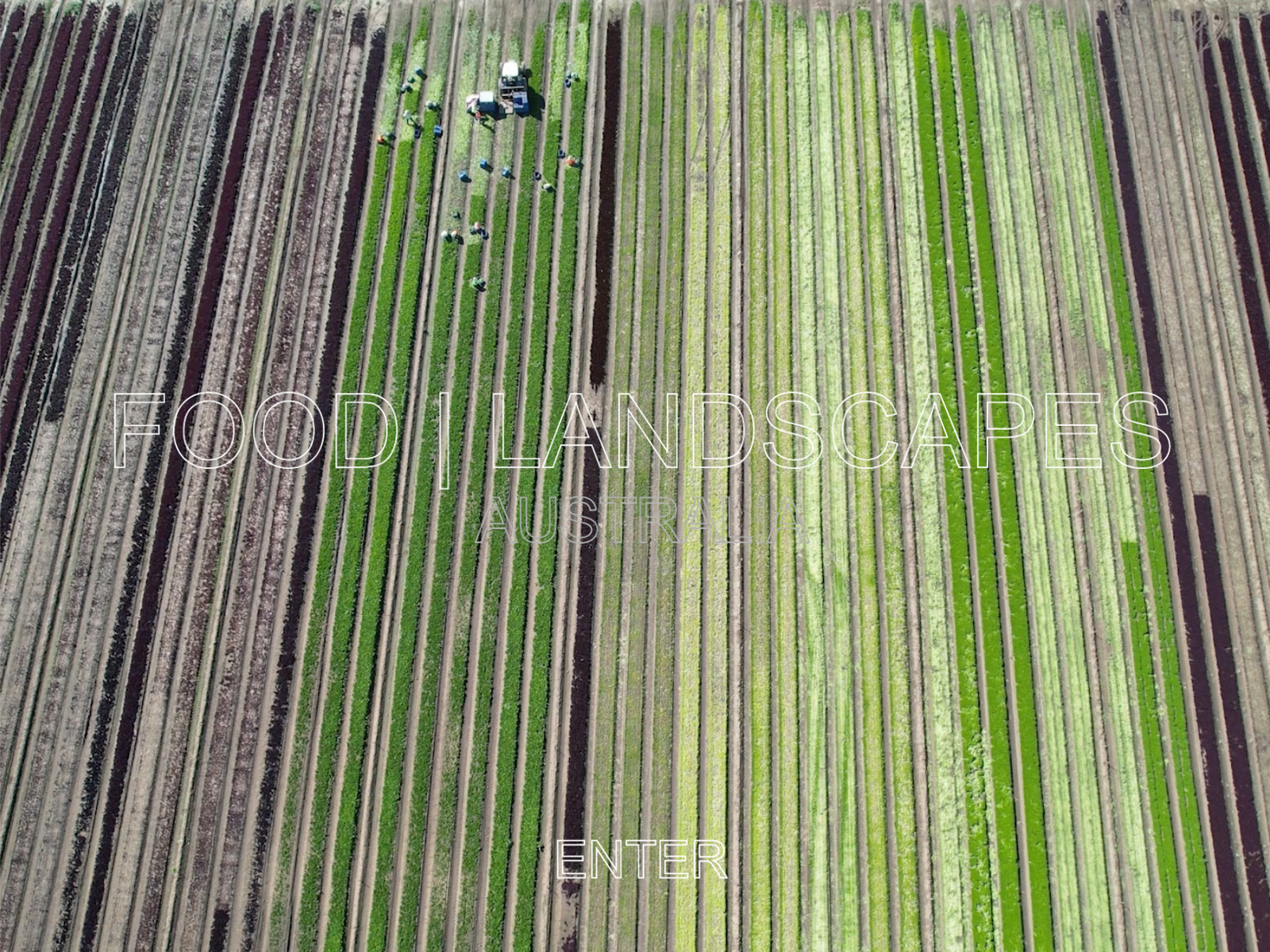 Based on geolocated database containing over 1,750 entries, 38,000km of systematic field research was conducted 2021-23 resulting in over 10,000 images and videos gathered by the author. Over 8.5 hours of moving image in 881 original aerial drone videos can be selected for viewing through an interactive web-based exhibition, that systematically links Australian foods with the landscapes that produce them.